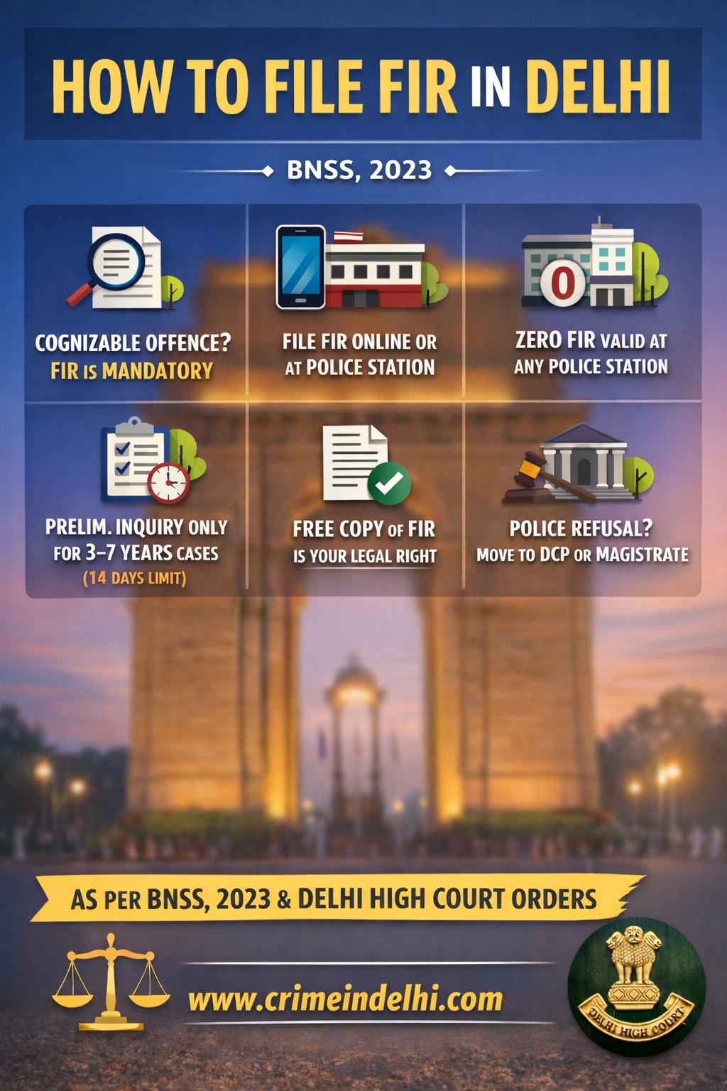 An FIR in Delhi is filed either at a police station or online. The governing procedure is now outlined in the Bharatiya Nagarik Suraksha Sanhita (BNSS) 2023, particularly Section 173, and features such as Zero FIR and e-FIR have been formalized. You can file in person at any police station (including as a Zero FIR), through the Delhi Police online/e‑FIR system for specified offences, or escalate to senior officers/magistrates if the SHO refuses to register it.