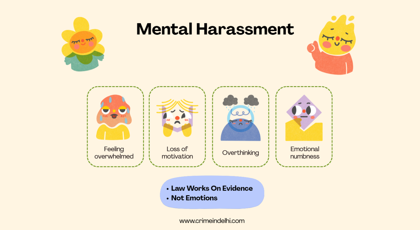 भारतीय कानून में “मेंटल हरासमेंट” के लिए एक ही अलग सेक्शन नहीं है, लेकिन स्थिति के अनुसार अलग-अलग कानून लागू हो सकते हैं।