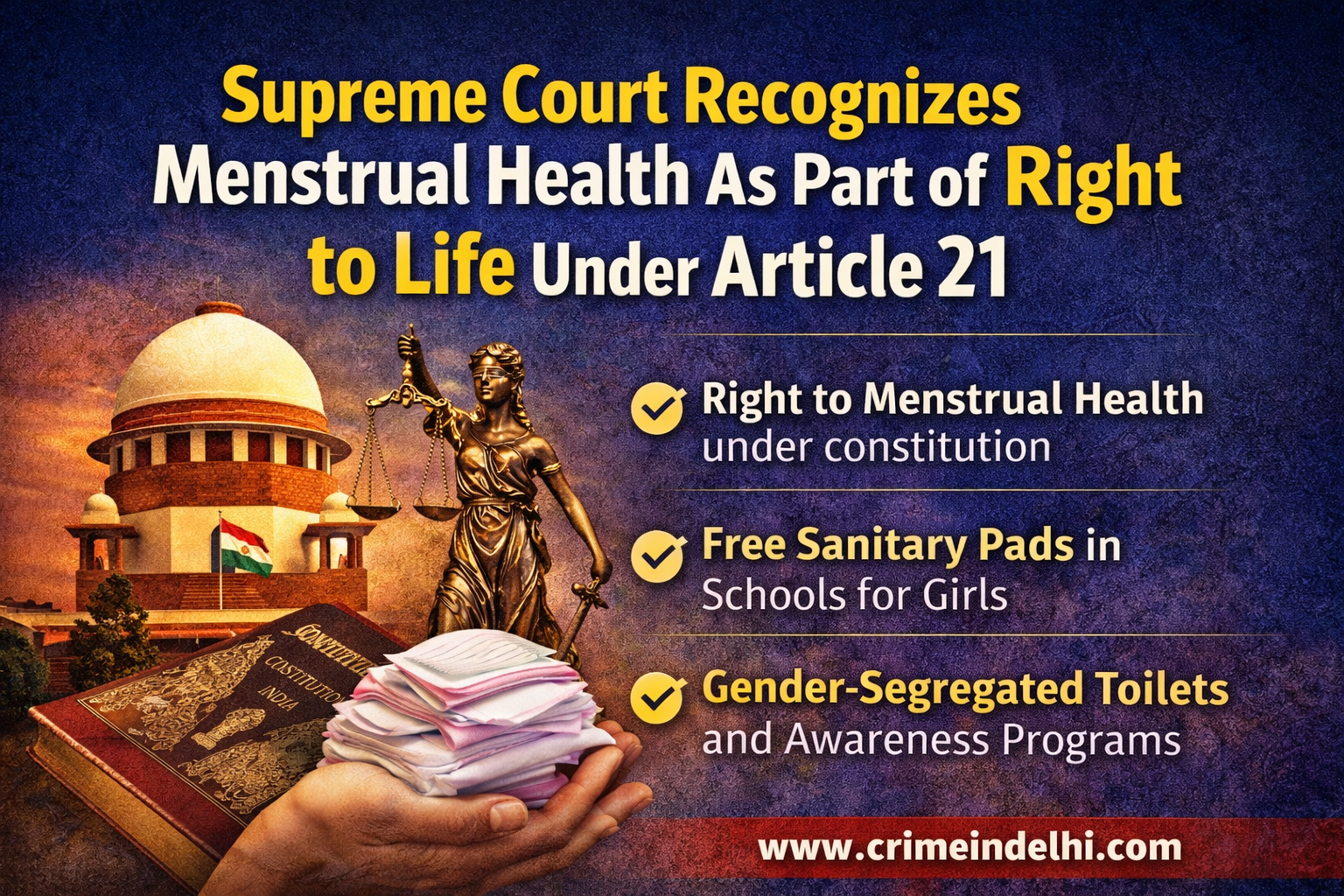 In a landmark constitutional development, the Supreme Court of India has unequivocally recognised that the right to menstrual health and hygiene forms an integral part of the right to life and personal dignity under Article 21 of the Constitution.
