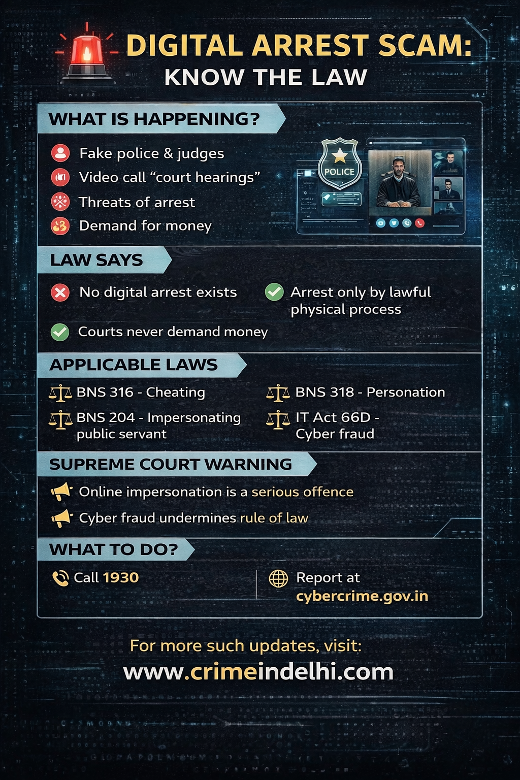 Digital arrest is not recognised under Indian law. A digital arrest scam is a form of organised cybercrime in which fraudsters: